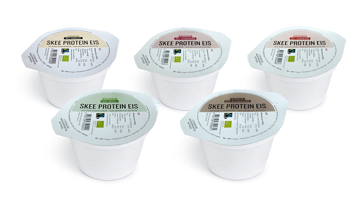 Wir haben unsere fünf Geschmacksrichtungen von Skee Protein-Eis in einer Box zusammengefasst: Vanille, Erdbeere, Himbeere, Apfel und Schokolade. Biologisch und völlig ohne Zusatzstoffe.